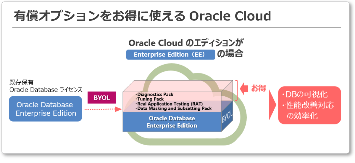 オンプレ環境でEnterprise Edition “のみ” をお持ちの方が、Oracle CloudのEnterprise EditionにBYOLするとします。その際にはOracle CloudのEnterprise Editionに含まれているDiagnostics PackやTuning Packなども使えるため、