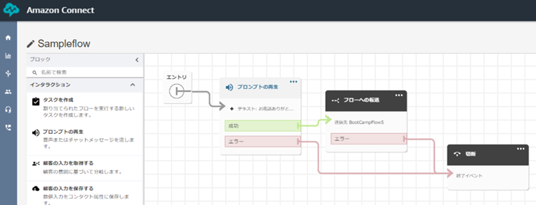 Amazon Connectでは、コンタクトフロー開発のためのGUIが用意されているため、ノーコードでコンタクトフロー開発が行えます。以下に開発画面の一例を記載します。
