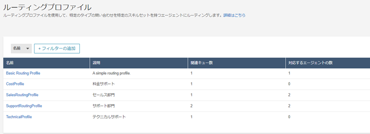 例として「ルーティングプロファイル」の権限制御について紹介します。「ルーティングプロファイル」とは、問い合わせ内容の分類ごとの対応オペレーターをグルーピングする機能のようなものです。以下の例では、料金サポート、テクニカルサポートといったルーティングプロファイルを作成しています。