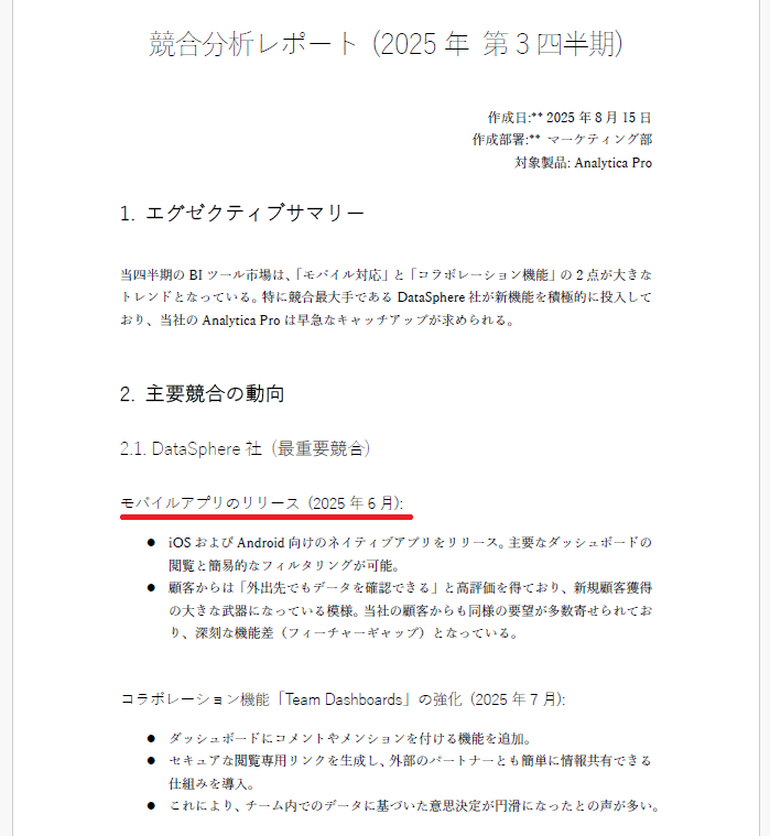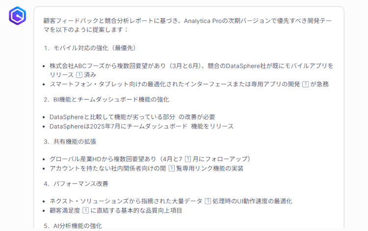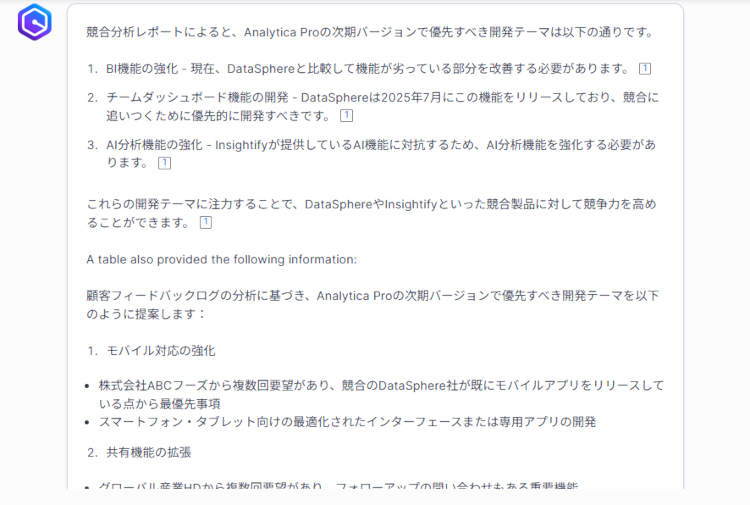 一見すると良い回答が返ってきているように感じますね。確かに、競合調査レポートから「チームダッシュボード」「AI分析機能」といった競合の動向を正しく抽出できています。また、顧客のフィードバックデータから「モバイル対応」「共有機能」「パフォーマンス改善」といった顧客の具体的な要望を、どの企業からの要望かも含めて正確に抜き出せています。