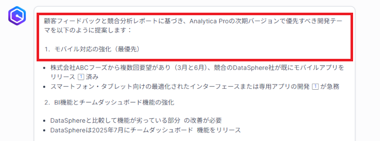 顧客フィードバック、競合分析レポートどちらも「モバイル対応」に触れられているため、モバイル対応が最優先のテーマという旨の回答をしてくれることを期待します。