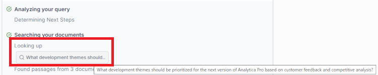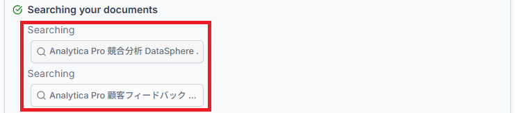 Agentic RAGを使用した場合は「競合分析」と「顧客フィードバック」の2つの質問にちゃんと分割されて調査をしていることがわかります。