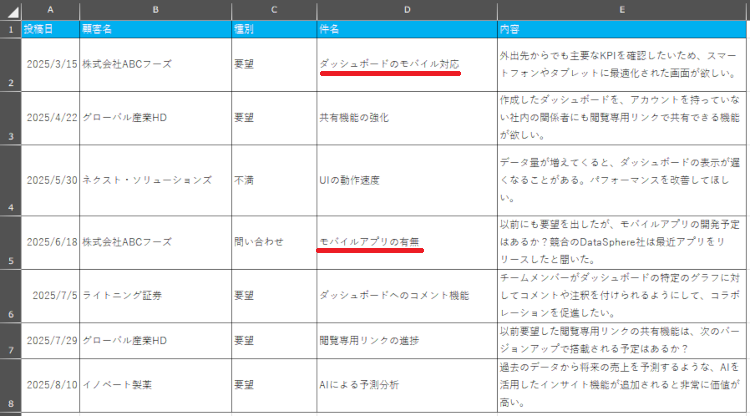 特にモバイル対応と共有機能については複数の顧客から要望があり、競合他社との差別化の観点からも優先度が高いと判断されます。