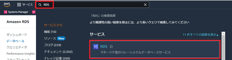 1.マネジメントコンソールの検索窓にて、Amazon RDSと入力します。表示されたAmazon RDSをクリックします。