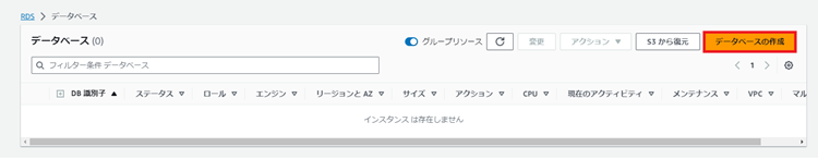 2.データベースの一覧画面から、「データベースの作成」をクリックします。