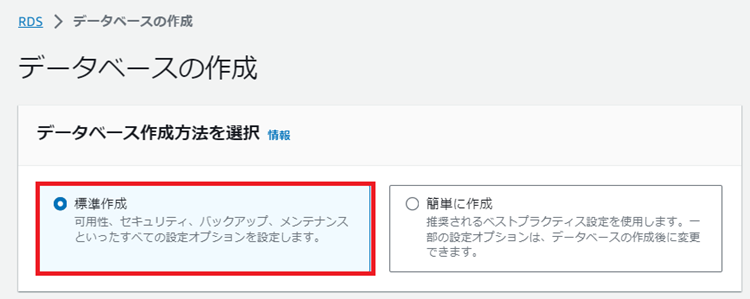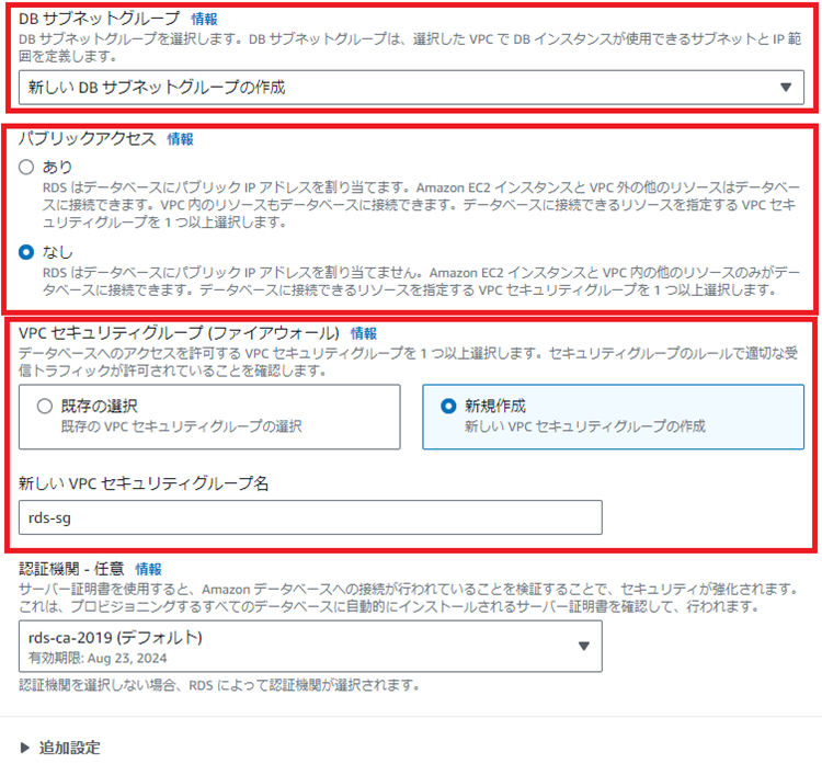 ※DBサブネットグループ、VPCセキュリティグループは事前に作成することもできますが、ここではインスタンス作成と同じ画面で新規作成の設定をします。
