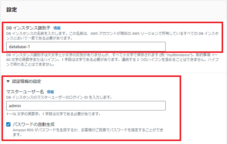 7.DBインスタンスの識別子、認証情報の設定を行います。ここでは以下の通り設定します。