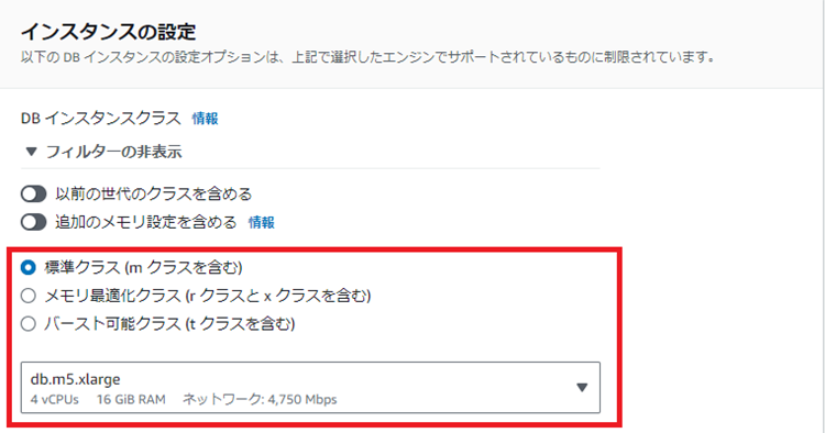 ここでは、標準クラスのdb.m5.xlargeを選択します。