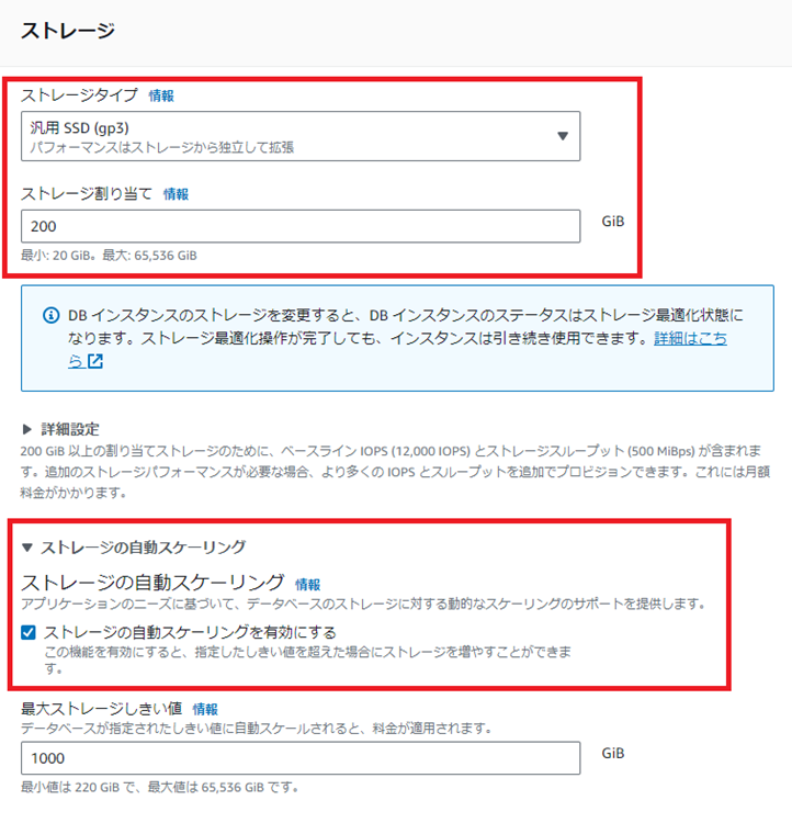 9.ここではストレージ設定全般、具体的にはストレージタイプ、ストレージ割り当て、ストレージの自動スケーリング設定を行います。以下の通り選択します。