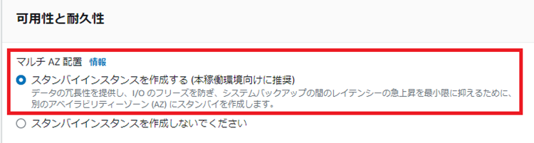 10.可用性と耐久性として、マルチAZ配置有無を選択します。