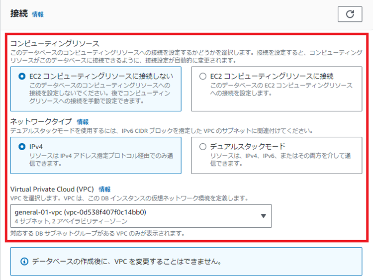 11.接続設定、具体的にはコンピューティングリソースへの接続設定、ネットワークタイプ、VPCの選定を行います。以下の通り選択します。