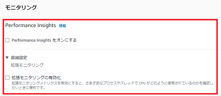 13.モニタリング設定として、Performance Insightsおよび拡張モニタリングの有効化有無を選択します。ここでは、どちらも無効にします。