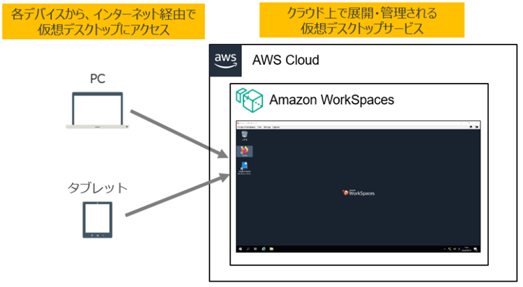 Amazon WorkSpacesは、AWSが提供するマネージドなクラウド型の仮想デスクトップサービスです。AWS上に展開された仮想デスクトップには、多様なデバイスからインターネット経由でアクセスできます。