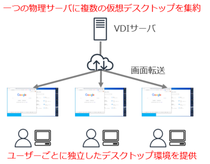VDIとはVirtual Desktop Infrastructureの略で、仮想デスクトップを利用する仕組み、あるいは仮想デスクトップを展開する基盤そのものを指します。 仮想デスクトップとは、単一のサーバー上で複数の仮想的なクライアントコンピュータ(デスクトップ)を起動させる技術を指します。 仮想デスクトップを活用することで、社員への業務用デスクトップの提供を効率的かつセキュアに行えます。