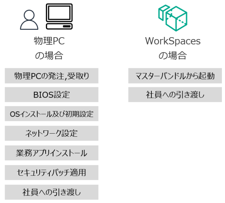 Amazon WorkSpacesでは、物理PC利用に比べ、社員にデスクトップを割り当てるまでのキッティング負荷を軽減することができます。