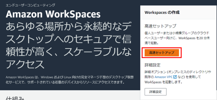 表示されたWorkSpacesコンソールの画面から、「高速セットアップ」をクリックします。