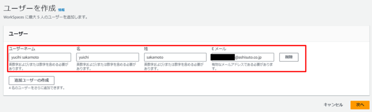 「ユーザーを作成」画面にて、空欄に必要な情報を記入します。