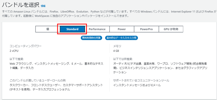 | スタンダード | 2 vCPU, 4 GB メモリ | 同上 | データ入力アプリケーション、テキスト編集、踏み台ホスト、ライブチャット、E メール、およびメッセージングアプリ |