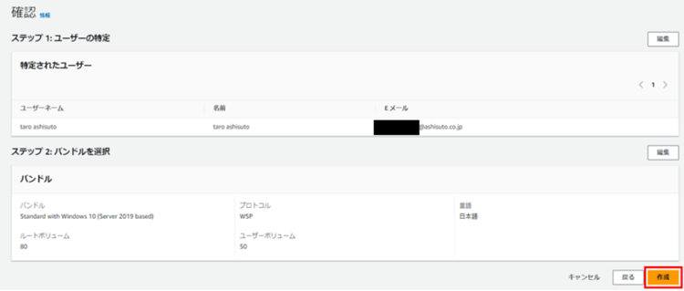 設定内容に間違いがないことを確認し、「作成」をクリックします。
