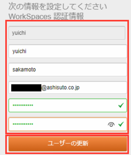 そこで認証情報の初期設定をします。空欄に上から名前・苗字・メールアドレス・パスワード・パスワード(2回目)を入力し、「ユーザーの更新」をクリックします。
