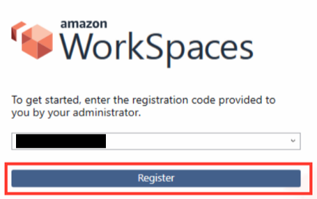 9-2.WorkSpacesクライアントの画面が表示されるため、先ほど「6.作成完了メールの確認」-「2.」で記載されている登録コードを入力しRegisterをクリックします。