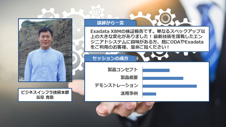 普段Exadataの構築支援を行っているエンジニアが実施した最新技術の検証結果だけでなく、従来のExadataとのパフォーマンス比較やOracle Exadata Cloud Serviceとの違いもお伝えします。