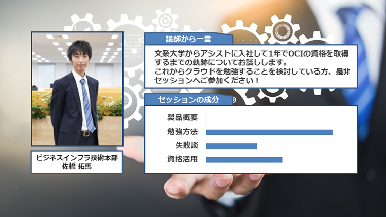 テクニカルフォーラムの中では数少ないビギナー向けのセッションです。2019年にアシストに入社し、クラウド技術者としてキャリアをスタートした若手社員がOracle Cloudの認定資格を取得するまでの勉強方法をご紹介します。