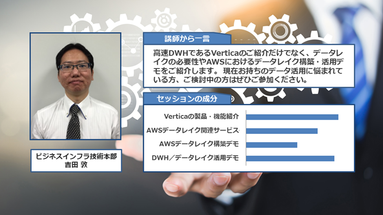本セッションではクラウドサービスを利用したデータレイクの構築デモや、高速DWHであるVerticaの活用方法を通じた「DWHとデータレイクの使い分け」についてご紹介します。