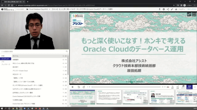 Cloud Database Days2022で使われているPanoptoは、アシスト社内の情報/ナレッジ/ノウハウの共有プラットフォームとしても活用されています。筆者自身もマーケティングやプロモーション、イベント運営などのノウハウを調べるときは、必ずPanoptoを使って調べ、すぐに情報を得ることができています。