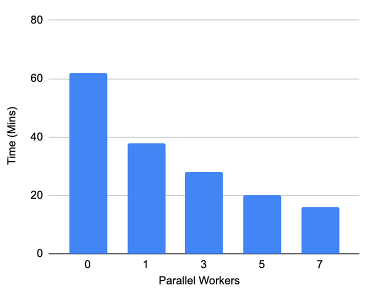 この時点のデータベースの複製を取得してデータベースを同じ状態に戻せるようにし、異なるワーカー数で並列バキュームを実行させ、実行時間の差異を測定しました。結果は次の通りです。