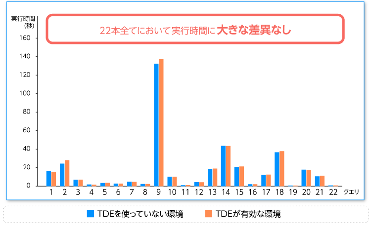 22本のクエリの実行時間は下記グラフで示すとおりの結果になりました。縦軸がクエリの実行時間(秒数)です。青軸がTDEを使っていない環境、オレンジ軸がTDEが有効な環境の結果ですが、22本全てにおいて実行時間に大きな差異はありませんでした。
