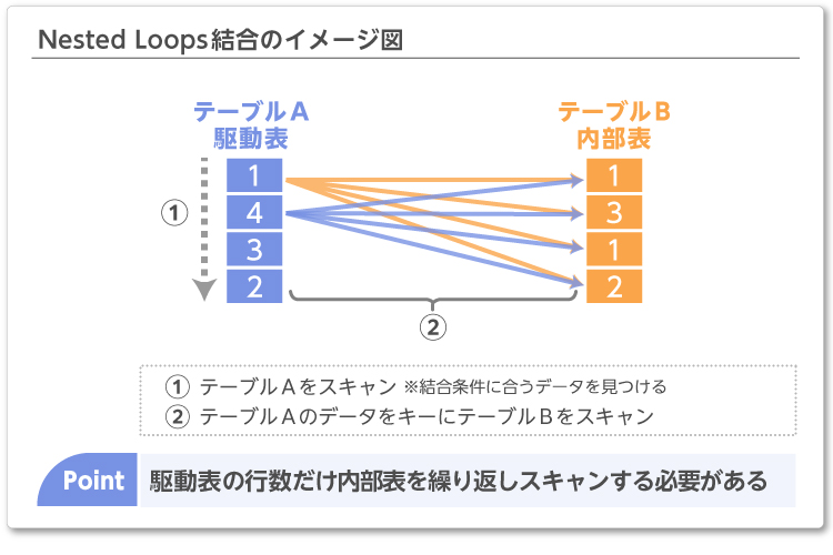 Nested Loops結合は、駆動表から1行データを取り出し、条件に合うデータを内部表から検索する結合方法です。そのため、駆動表のデータが少量の場合に効果的な結合方法となります。