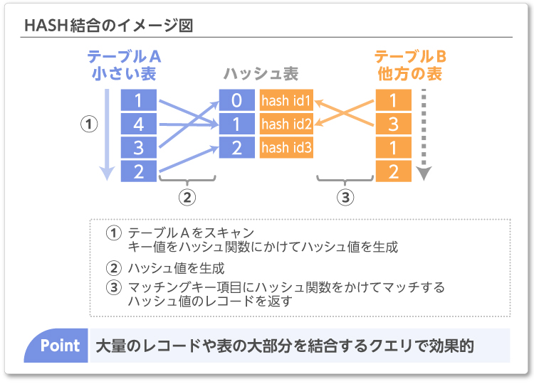 WHERE句の条件に「=」の等価条件がある必要はありますが、データ量が多い場合は、外部表と条件に合うデータがあるか毎回内部表に繰り返しアクセスするNested Loops結合よりも効率的な結合方法です。