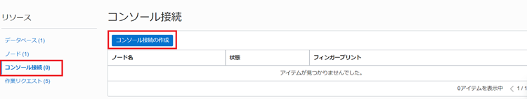 1.管理コンソールにてSSH接続できないBaseDBの画面に移動し、画面左下から[コンソール接続]をクリックし、[コンソール接続の作成]をクリックします。