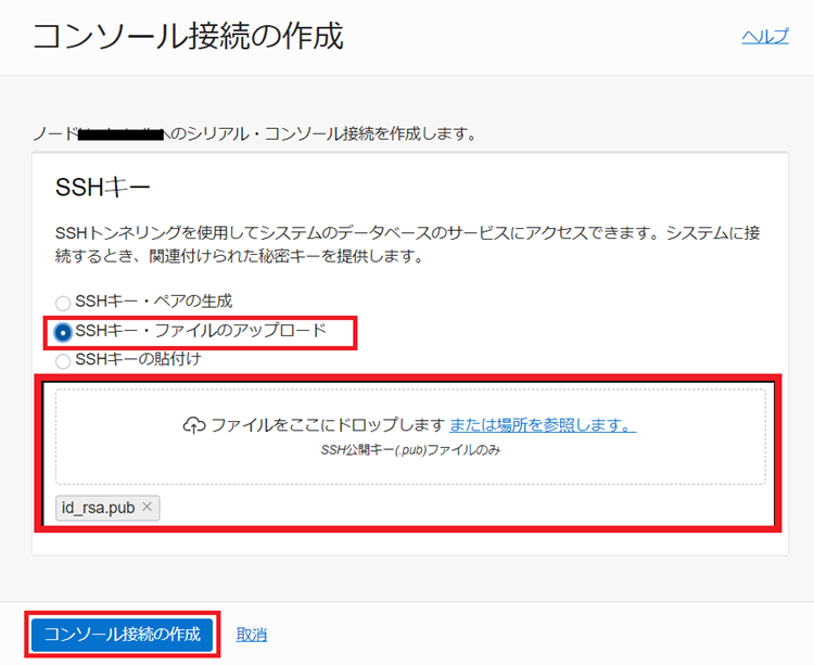 2.「SSHキー・ファイルのアップロード」を選択し、SSH公開鍵ファイルをドロップし、[コンソール接続の作成]をクリックします。