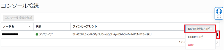 3.作成されたコンソール接続の右端の三点マークをクリックし、[SSH文字列のコピー]をクリックします。