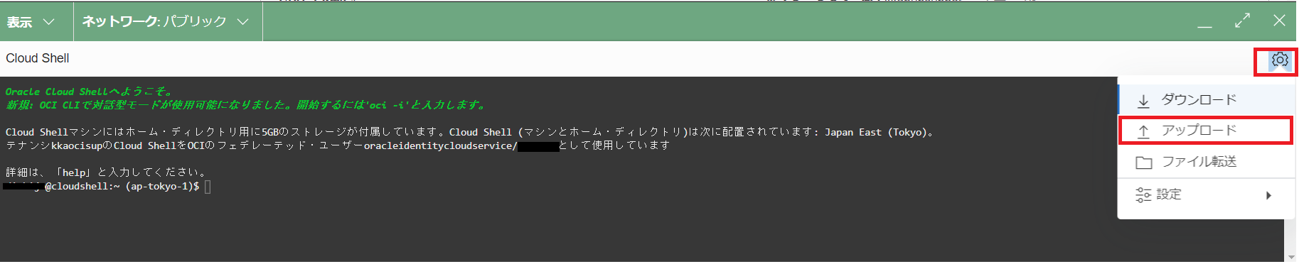 プロンプト右上の歯車メニューをクリックし、アップロードをクリックします。「1.BaseDBでコンソール接続を作成」の項番2で用意した公開鍵とペアになる秘密鍵をアップロードし「.ssh」ディレクトリ配下に配置します。