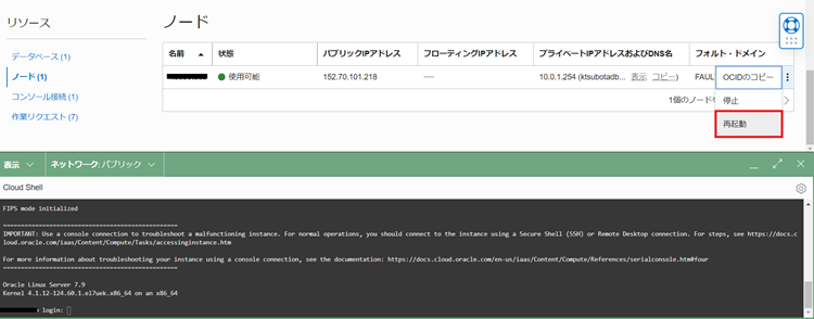 1.Step2のCloud Shellはそのままで、管理コンソールから対象のBaseDBのノードを再起動します。