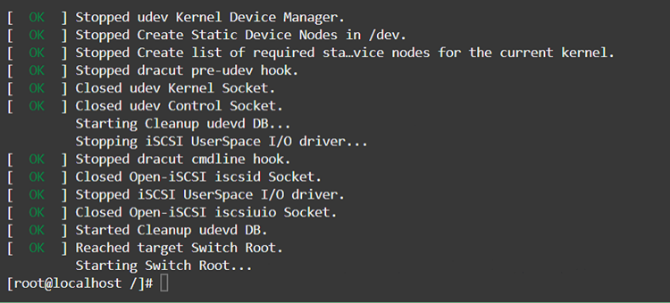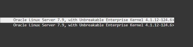 linuxefi /vmlinuz-4.1.12-124.60.1.el7uek.x86_64 root=/dev/mapper/VolGr\ oupSys1-LogVolRoot ro rd.lvm.lv=VolGroupSys1/LogVolRoot rd.lvm.lv=VolGroupSys1\ /LogVolSwap rd_NO_LUKS LANG=en_US.UTF-8 rd_NO_MD rd.shell SYSFONT=latarcyrheb-\ sun16 selinux=0 KEYBOARDTYPE=pc KEYTABLE=us pci=noaer crashkernel=256M@64M log\ level=3 panic=60 transparent_hugepage=never ipv6.disable=1 audit=1 intel_idle.\ max_cstate=1 nofloppy nomce numa=off console=ttyS0,115200 iscsi_initiator=iqn\ .1994-05.com.domain:01.1846a2 netroot=iscsi:@169.254.0.2::3260::iqn.2015-02.o\ racle.boot:uefi ip=dhcp biosdevname=1 rd_NO_DM PRODUCT=ORACLE_SERVER_X5-2 TYPE\ =X5_2_LITE_IAAS intremap=off nvme.nvme_io_queues=32 iscsi_param=node.session.t\ imeo.replacement_timeout=6000 init=/bin/bash ★末尾に入力します