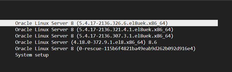 linux ($root)/vmlinuz-5.4.17-2136.326.6.el8uek.x86_64 root=/dev/mapper/vg00-ro\ ot ro LANG=en_US.UTF-8 audit=1 console=hvc0 console=tty0 console=ttyS0,9600n8 \ crashkernel=auto ip=single-dhcp ipmi_si.tryacpi=0 ipmi_si.trydefaults=0 ipmi_s\ i.trydmi=0 libiscsi.debug_libiscsi_eh=1 loglevel=3 net.ifnames=1 netroot=iscsi\ :169.254.0.2:::1:iqn.2015-02.oracle.boot:uefi network-config=e2NvbmZpZzogZGlzY\ WJsZWR9Cg== nomodeset nvme_core.shutdown_timeout=10 rd.dm=0 rd.iscsi_param=nod\ e.session.timeo.replacement_timeout=6000 rd.luks=0 rd.lvm.lv=vg00 rd.md=0 vcon\ sole.font=latarcyrheb-sun16 vconsole.keymap=us numa=off transparent_hugepage=m\ advise biosdevname=1 rd_NO_DM PRODUCT=ORACLE_SERVER_X5-2 TYPE=X5_2_LITE_IAAS i\ ntremap=off init=/bin/bash rw ★末尾に入力します
