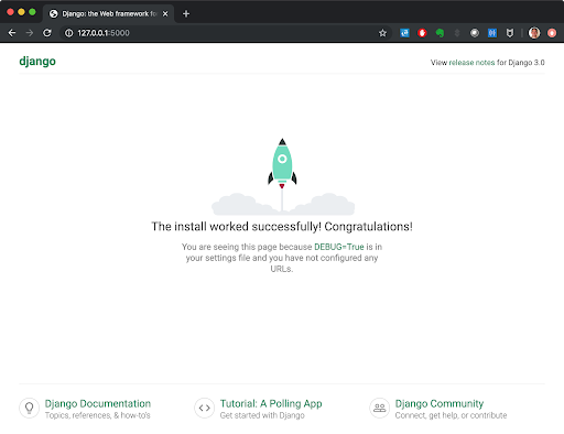 (myprojectenv) [root@pga bin]# python manage.py runserver 0.0.0.0:5000 Watching for file changes with StatReloader Performing system checks... System check identified no issues (0 silenced). December 06, 2019 - 07:06:22 Django version 3.0, using settings 'myproject.settings' Starting development server at http://0.0.0.0:5000/ Quit the server with CONTROL-C.