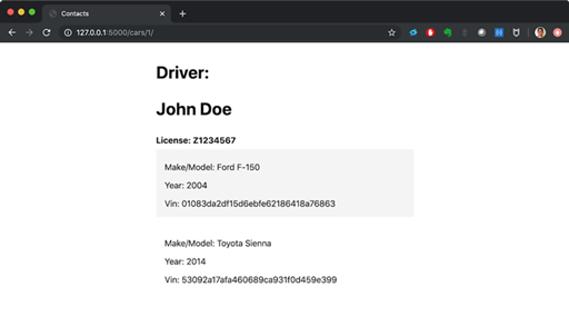 postgres=# select * from cars_driver; id | name | license ----+----------+---------- 1 | John Doe | Z1234567 2 | Jane Doe | Z9876543 (2 rows) postgres=# select * from cars_car; id | make | model | year | vin | owner_id ----+--------+--------+------+----------------------------------+---------- 1 | Ford | F-150 | 2004 | 01083da2df15d6ebfe62186418a76863 | 1 2 | Toyota | Sienna | 2014 | 53092a17afa460689ca931f0d459e399 | 1 3 | Honda | Civic | 2018 | 844c56840b5fc26d414cf238381a5f1a | 2 4 | GMC | Sierra | 2012 | 29aeffa4d5aa21d25d7196db3728f72c | 2 (4 rows)