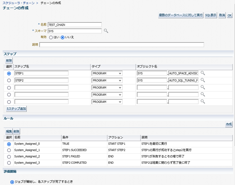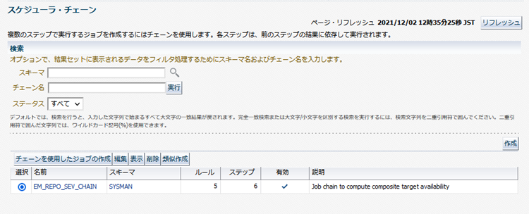 データベースの管理画面より、[管理]-[Oracle Scheduler]-[チェーン]の箇所より設定可能です。