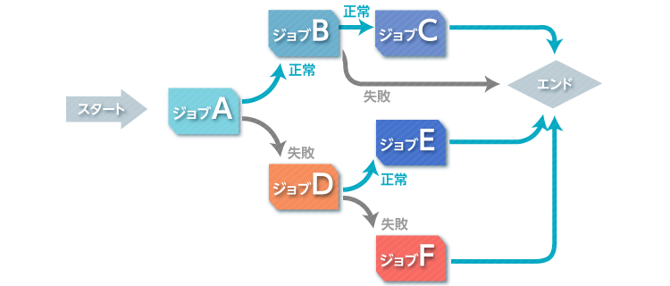 例えば以下の図はジョブAのメイン処理を実行させ、正常に完了した場合のみ後続処理のジョブB、ジョブCを実行するという処理です。メイン処理のジョブAが失敗した場合はリカバリ処理のジョブDを実行させ、リカバリ処理の成功、失敗により実行させるジョブを変化させるといったジョブ・チェーンとなります。