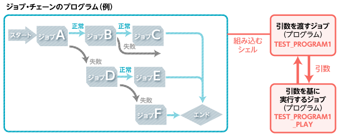 しかし実際に実行するジョブでは引数を含むジョブを実行させることが要件となっていることがあります。そのような場合には、引数を渡すシェルをジョブ・チェーンで実行するジョブと引数を必要とするジョブの間に作成することで対応出来ます。