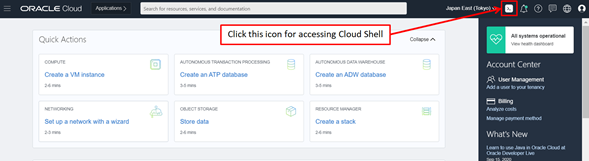 Oracle Cloudのダッシュボード画面より右上にあるCloud Shellのアイコンをクリックします。