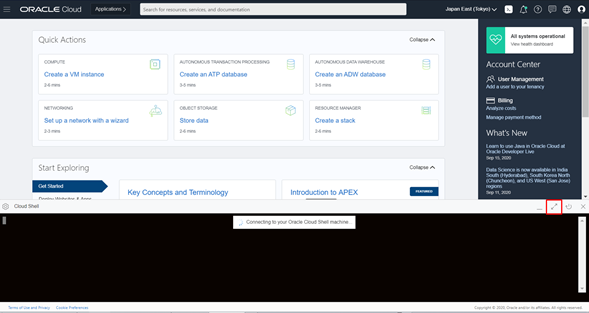 数秒でOracle Cloud Shellに接続され、画面の下部にCloud Shellが表示されます。