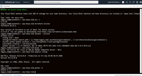Cloud Shellでは、OCI CLI、SQL * Plus 、MySQLクライアント、Java、Python、Ansible、Terraformなどの多くのツールが事前に構成されています。