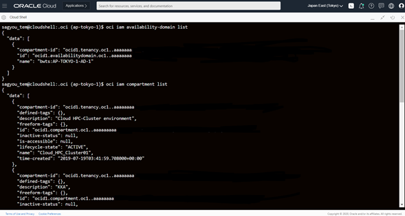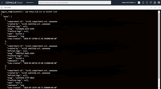 Cloud Shell では、OCI CLIは事前構成されているため、OCI CLIコマンドを直接実行できます。設定は不要です。例として、以下2つのOCI CLIコマンドを実行した際の出力を掲載します。
