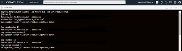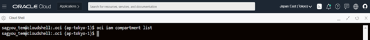 プロファイル[ap-tokyo-1]のデフォルトのコンパートメントを追加したので、以下のコマンドを実行してみましょう。